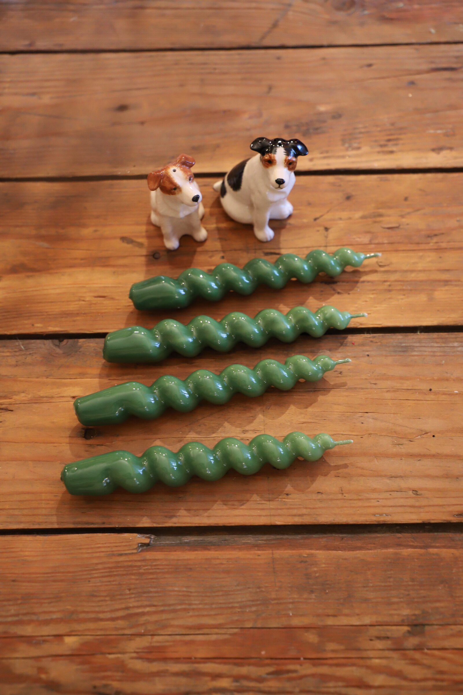 Estuche de 4 velas con forma espiral brillante en tono verde, cera mineral.