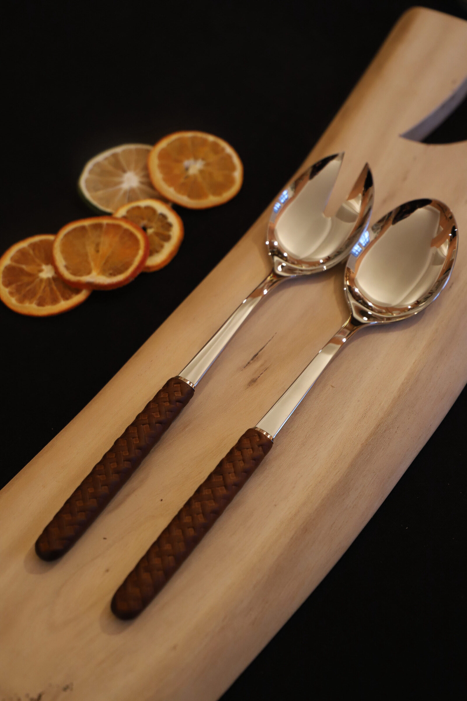 El Juego Servir Ensalada marrón de Espigas de Trigo es un set de cubiertos pensado para facilitar el servicio de ensaladas y platos en la mesa. Presenta un diseño elegante en color marrón y forma clásica, ideal para acompañar comidas y reuniones con estilo. Estos utensilios combinan funcionalidad y estética y forman parte de la colección de cubiertos de servir disponibles en la tienda online de Espigas de Trigo.