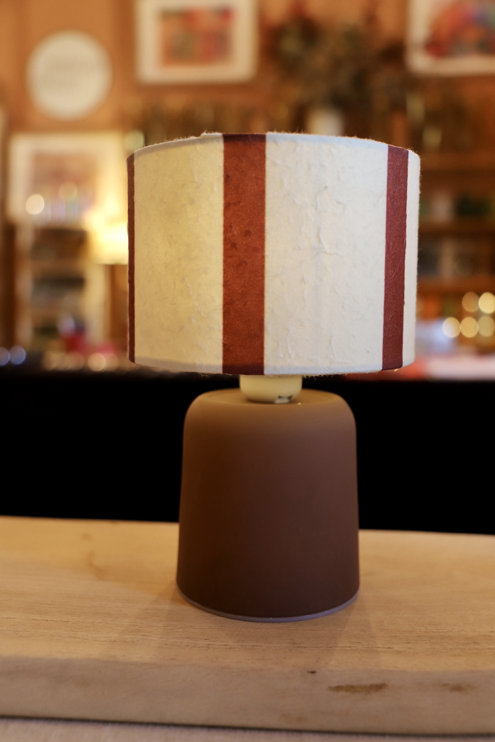 Lámpara inalámbrica con base de cerámica borgoña y pantalla en rayas.