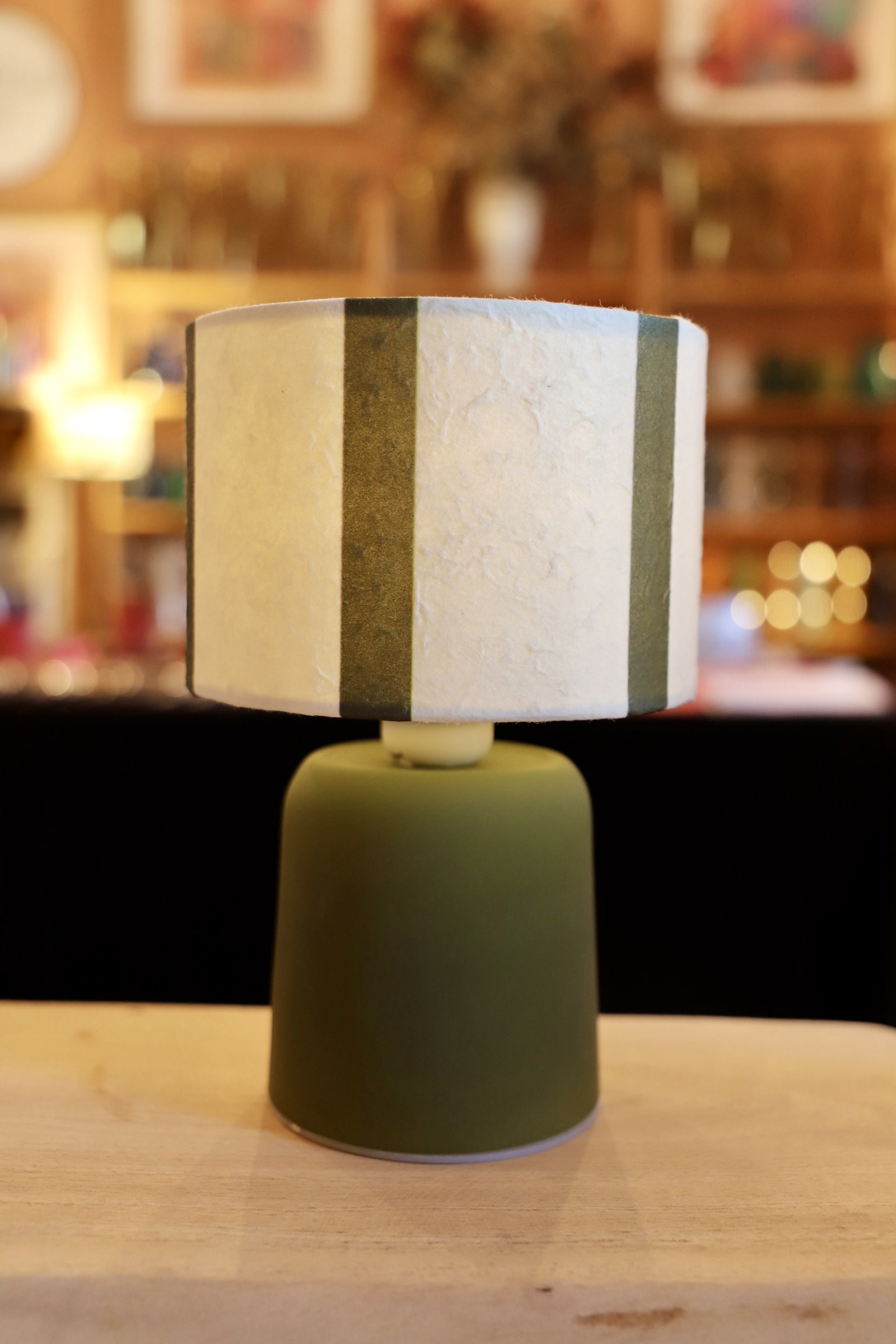 Lámpara inalámbrica con base de cerámica verde y pantalla en rayas.