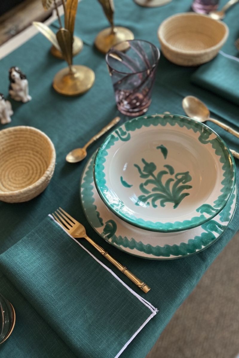 Eleva tus momentos únicos a nuevas alturas de refinamiento con nuestro mantel de lino petróleo y su encantador bordado. Es más que una pieza de mesa; es una expresión de tu gusto por lo excepcional, lo auténtico y lo bello en la vida.