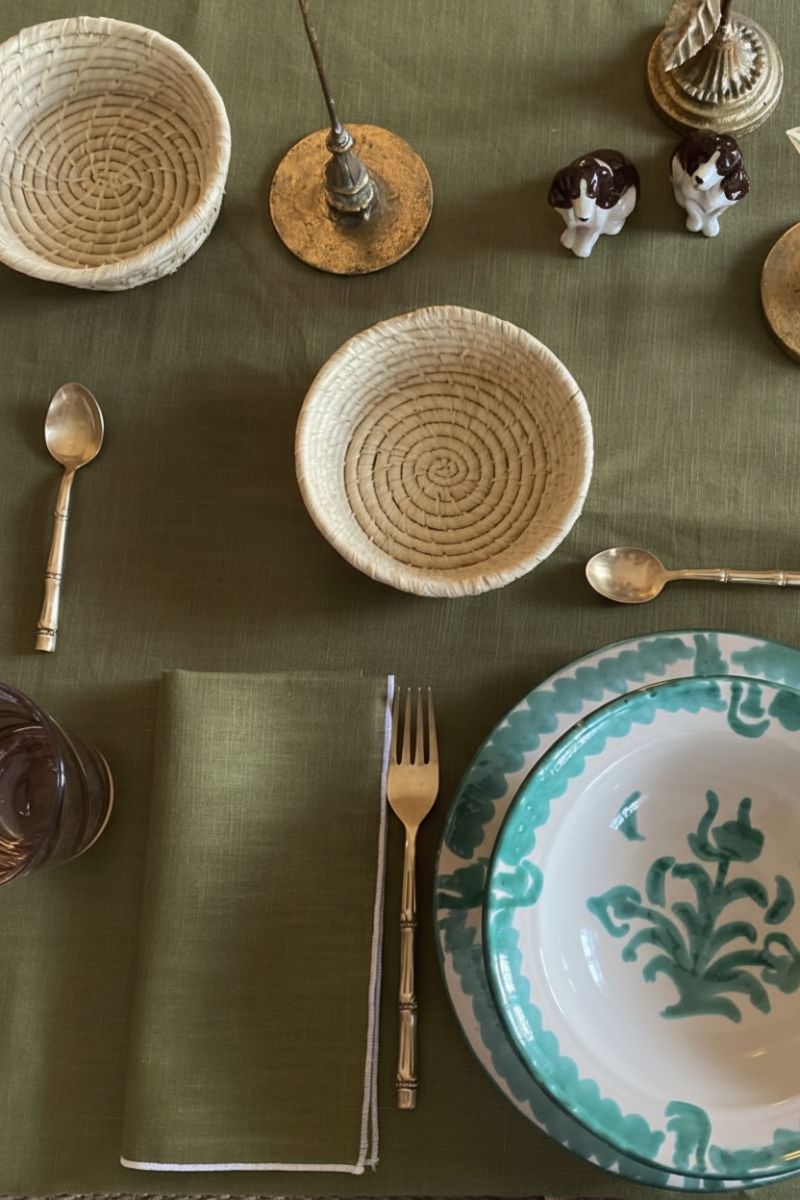Eleva tus momentos únicos a nuevas alturas de refinamiento con nuestro mantel de lino verde aceituna y su encantador bordado. Es más que una pieza de mesa; es una expresión de tu gusto por lo excepcional, lo auténtico y lo bello en la vida.