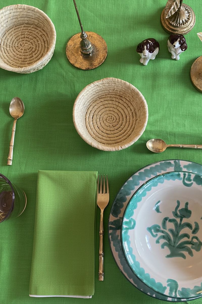 Eleva tus momentos únicos a nuevas alturas de refinamiento con nuestro mantel de lino verde y su encantador bordado. Es más que una pieza de mesa; es una expresión de tu gusto por lo excepcional, lo auténtico y lo bello en la vida.