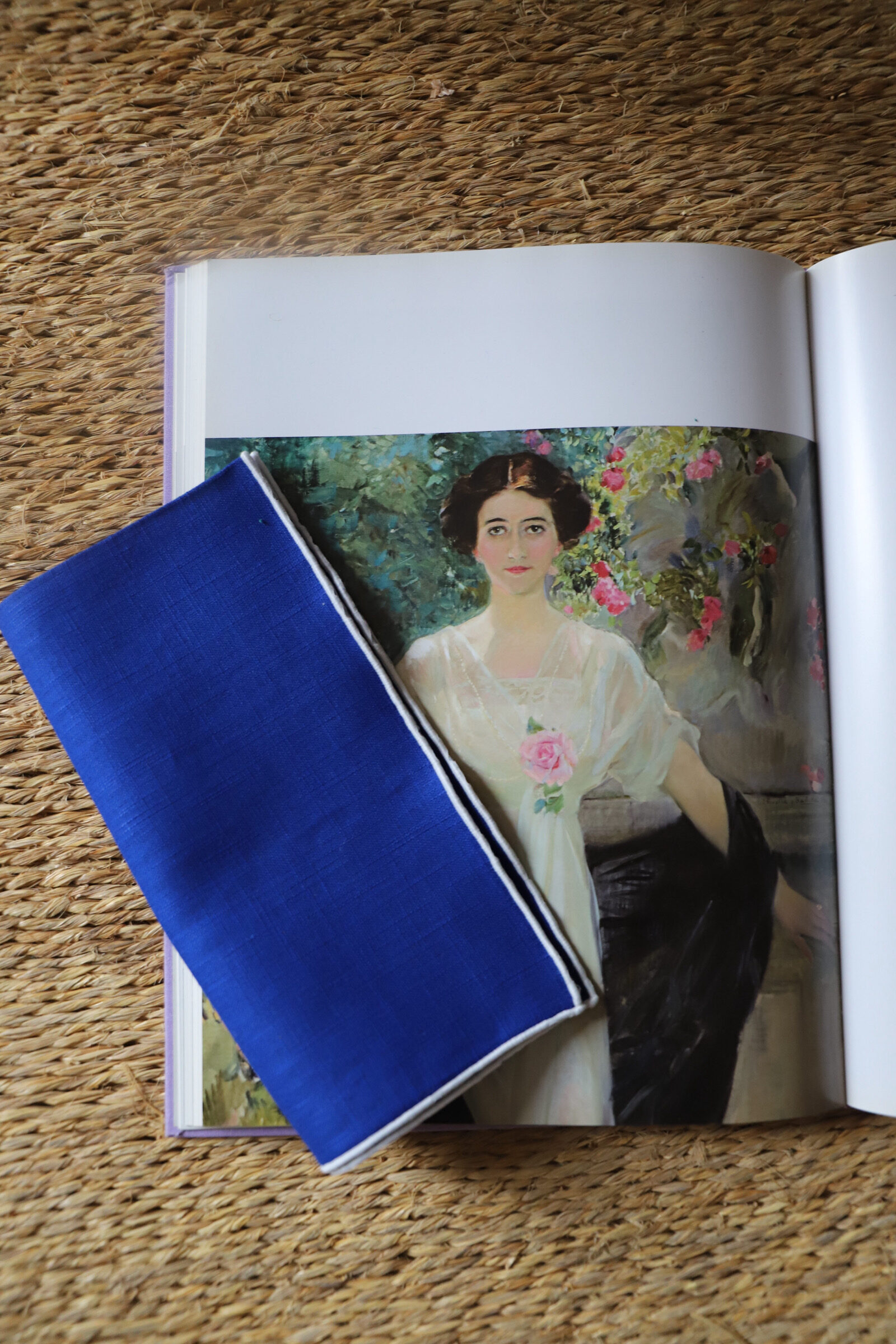 Servilleta de lino de tamaño 45*45 cm en color azulina con festón en color blanco.
