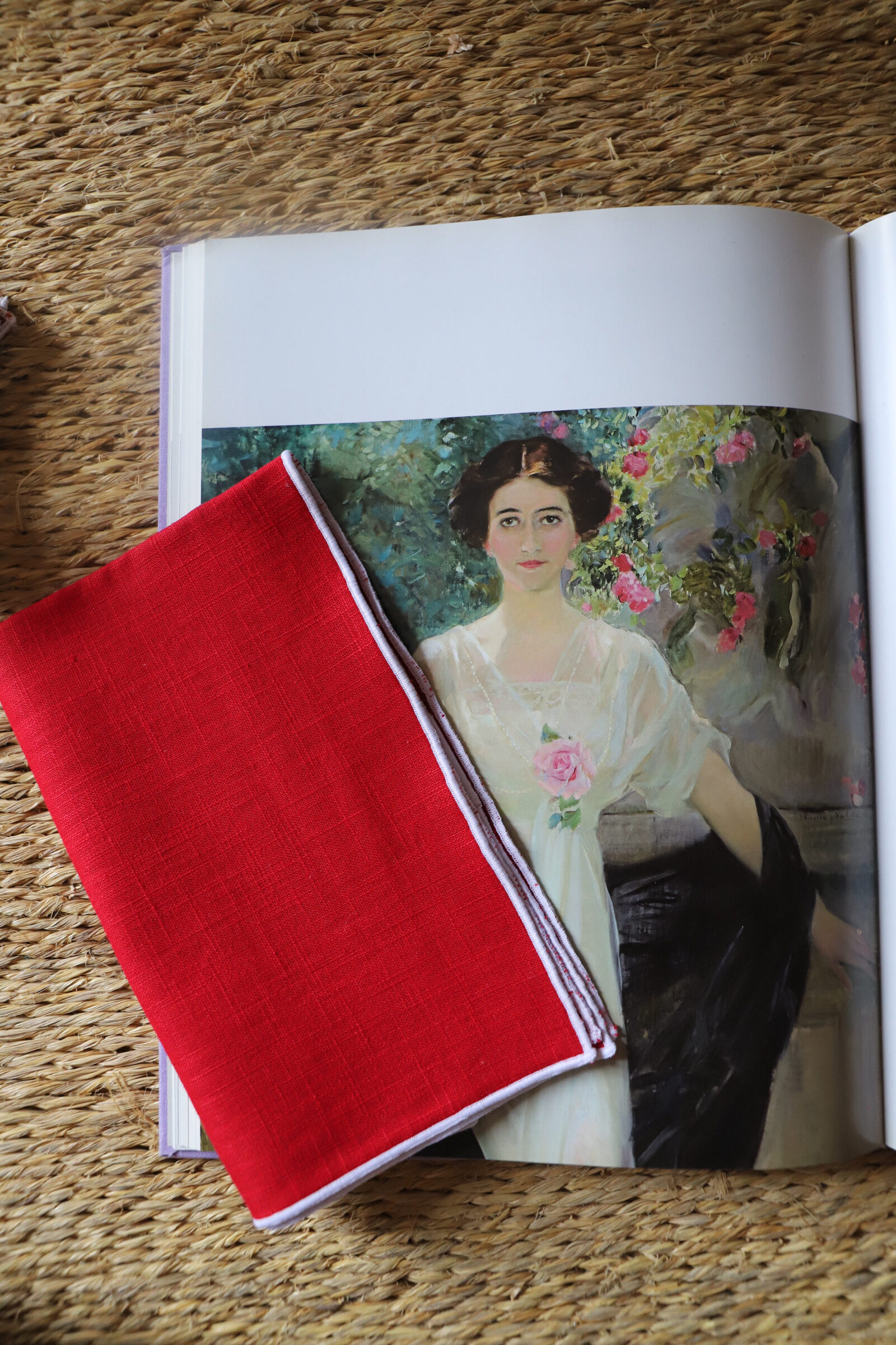 Servilleta de lino de tamaño 45*45 cm en color caldera con festón en color blanco.
