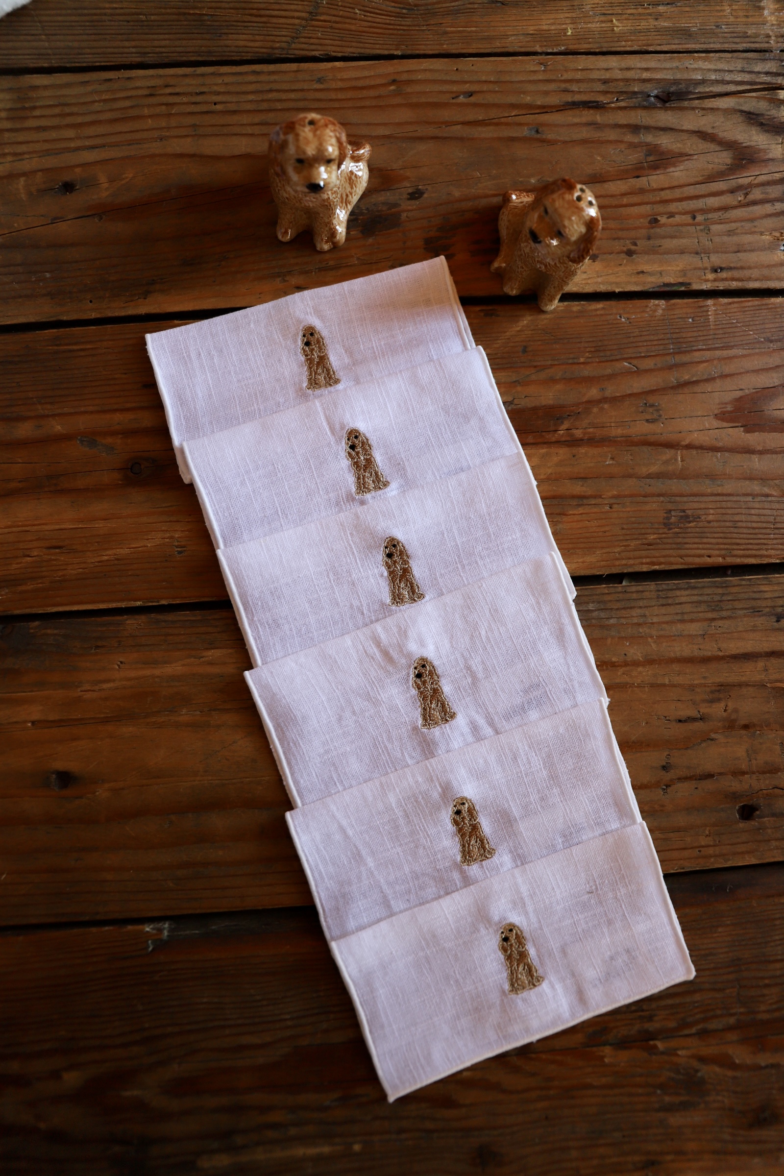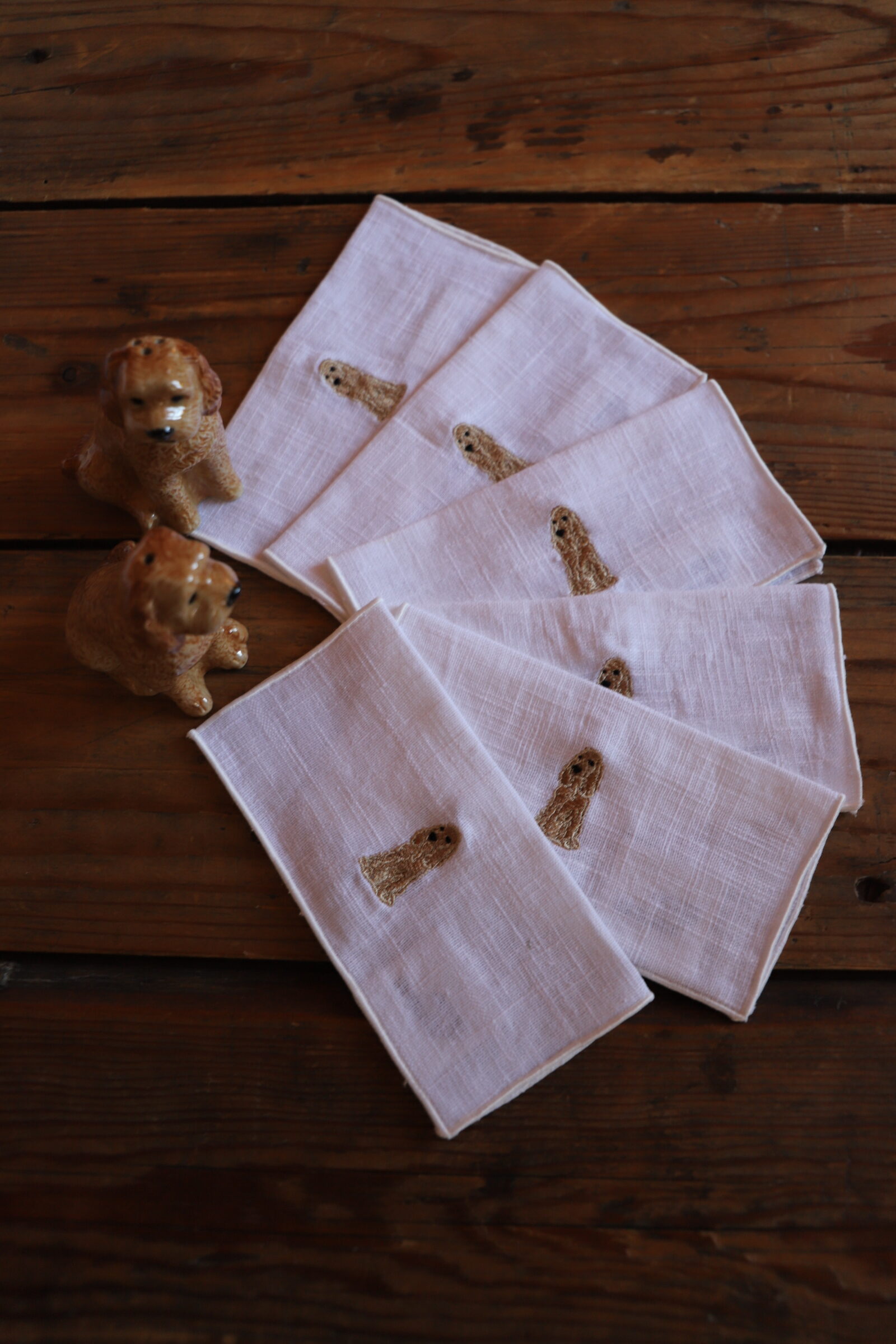 Servilletas de aperitivo con bordados de Cocker. Las servilletas miden 15*15 cm abiertas.
